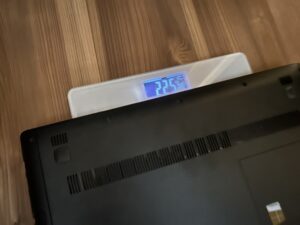 (体重計に乗る私物PC。説明書には2.5kgと書いてありました。痩せたんだね…)